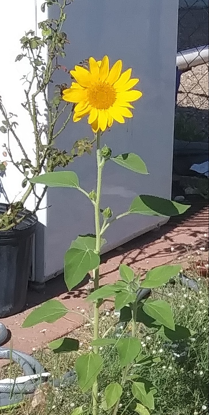 In my neighbor’s messy yard, slowly filling with real junk, a dead washer, a used-up barbecue or two, the above “volunteer” soared to stand in our bright sun after unusual rainfall. All over town, real sunflowers sun-worship. This year there are few bees to worship them in turn, no furry legs tickling their petals. Strange to think of a sunflower being lonely, isn’t it? Their periscope flowers search all day for sun-borne bees.