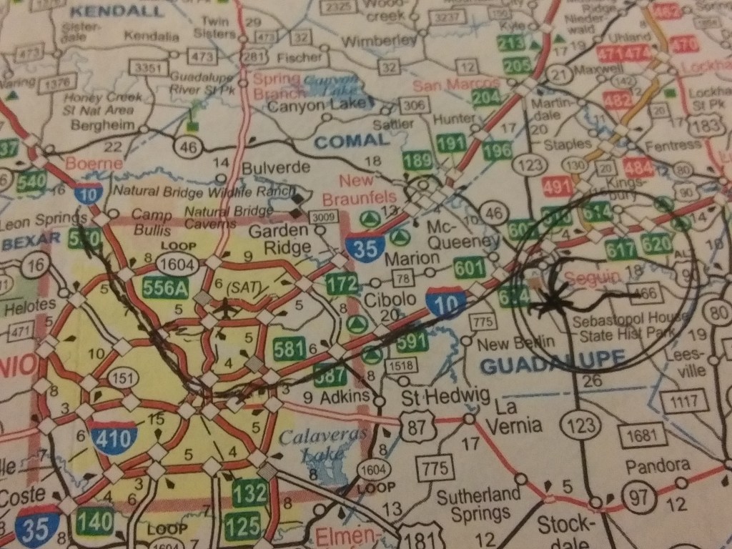 My Volt performs valiantly. We hustle East as though magnetized to the bold & glaring sun. I move through discs 3 to 8 on the book on CD in the player, This Tender Land, by William Kent Kreuger. It’s one long drive to Seguin. In all that distance, there was only one sign for the city at one complicated turn.