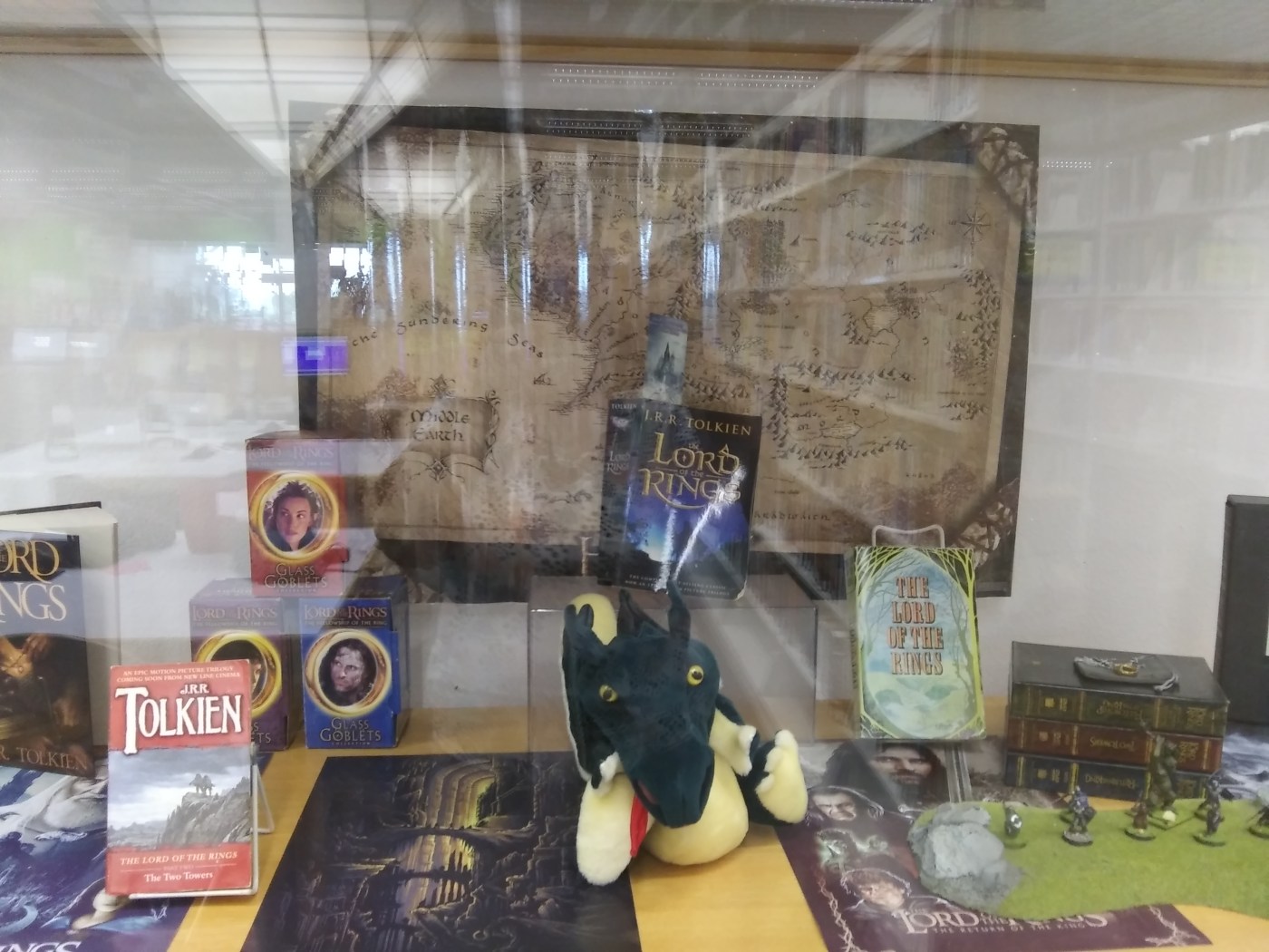 I sat at the table in the library for some while before really taking in what was in front of me: a shrine to Lord of the Rings – complete with a fluffy Smaug. I gazed into the glass & was transported to the first time I was given The Hobbit. My high school boyfriend was going to Vietnam. In full uniform, head shaved & sheared, trim, muscular. We faced off in the bus terminal as he said something like, “You’ll enjoy this, I think.” But I don’t really remember his words.